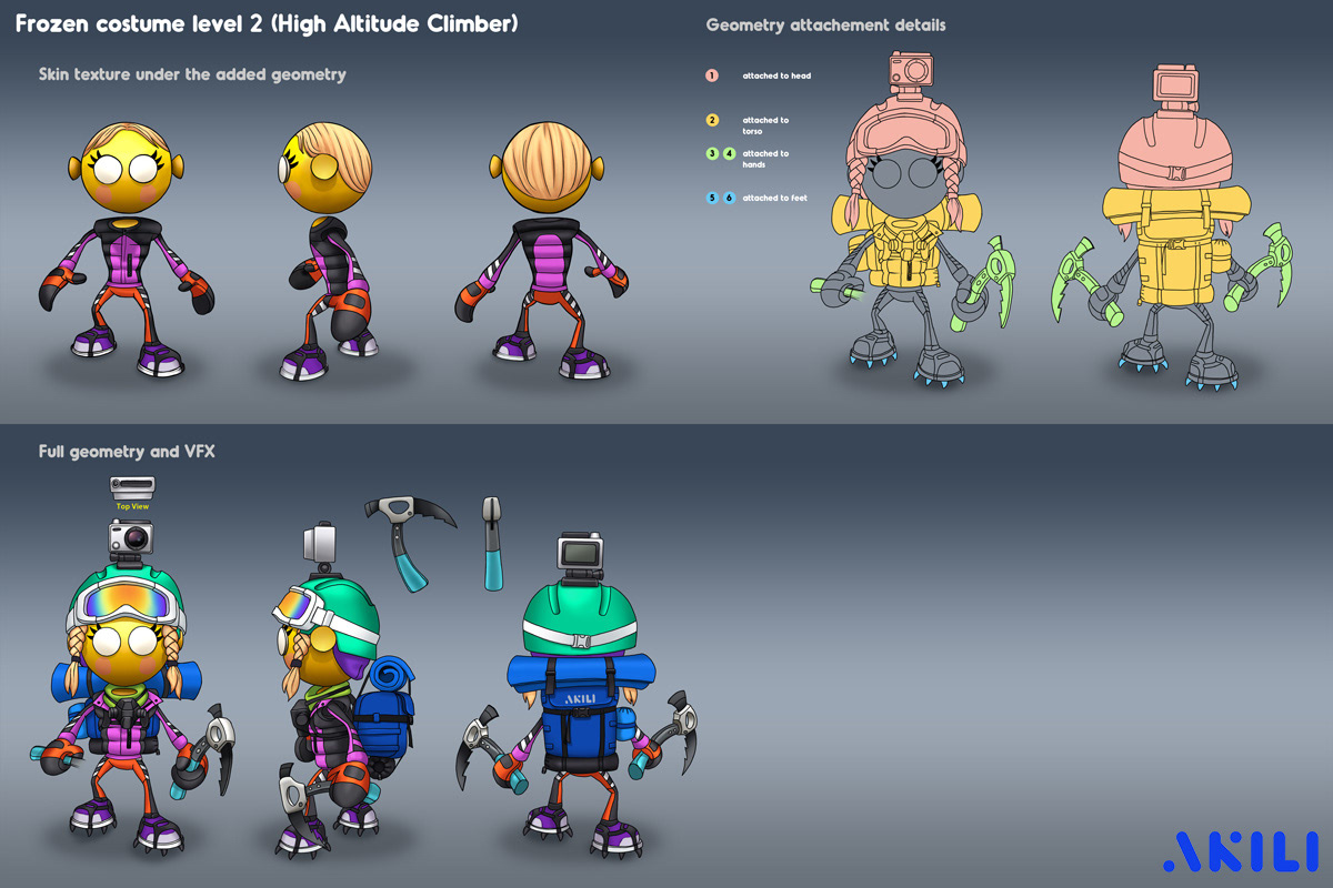 I spent much of 2018 creating concept art for Akili Interactive’s Endeavor game which helps treat ADHD in children ages 8-12. One of my many tasks was to develop fun costumes and skins for the “Akilian” alien characters that the players control. I did not develop the original Akilian character (top image) but I had the opportunity to develop many ‘skins’ – costumes and variations on the character – for players to collect. All of these skins were required to fit the proportions and body shape of the original Akilian (more or less) while bringing something exciting and new to the wardrobe collection. All costumes had to be shown in full detail and from all sides so that they could be modeled and textured by an external development house. Despite the large number of costumes shown here, I’m only displaying a portion of the ones I created for the game.