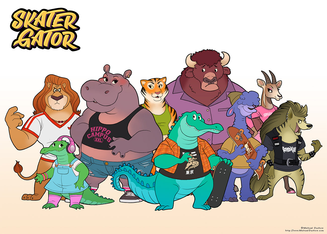 This is Ollie Gator, doing tricks at the skatepark by the beach where all his friends hang out. This was done for a character design challenge, but I’d been dying to draw some fun action shots of skaters. As you can see I did a bunch of early sketches of other animals before landing on Ollie here, but scroll down to see some of the other skating animals.